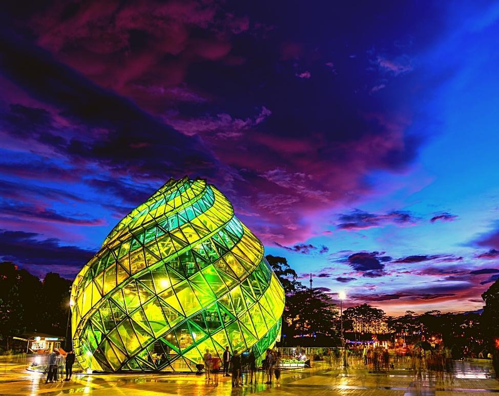 Đây có lẽ là biểu tượng nổi bật nhất của Quảng trường Lâm Viên. Với chiều cao lên đến 15m, nụ hoa Atiso được thiết kế bằng kính màu vàng, mô phỏng chân thực hình ảnh cánh hoa đang hé nở. Bên trong nụ hoa Atiso là một quán cà phê rộng 150m², tạo không gian lý tưởng để bạn vừa nhâm nhi đồ uống nóng hổi, vừa ngắm nhìn toàn cảnh quảng trường và hồ Xuân Hương, đồng thời chụp được những bức ảnh nghệ thuật từ cả bên trong lẫn bên ngoài. Ánh sáng tự nhiên xuyên qua lớp kính màu vàng tạo hiệu ứng lung linh đặc biệt, khiến mọi góc chụp đều trở nên ấn tượng.
